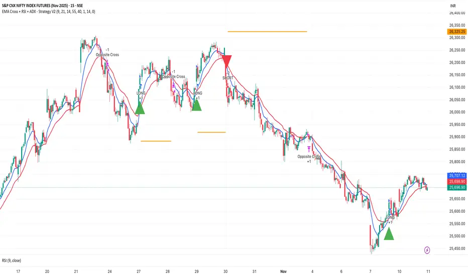 A versatile trend-following strategy combining EMA 9/21 crossovers with RSI momentum filtering and optional ADX trend strength confirmation. Designed for both cryptocurrency and traditional futures/options markets with built-in stop loss management and automated position reversals.