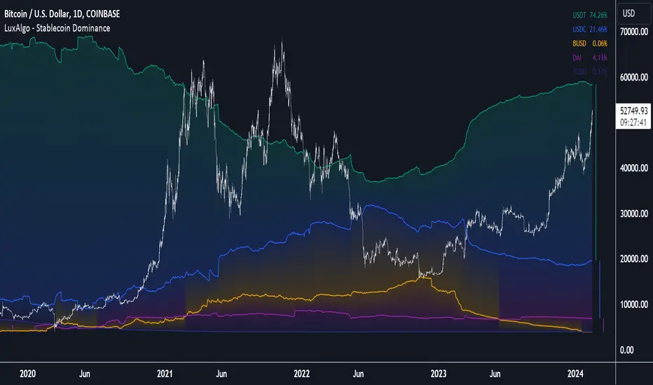 This dominance graph is displayed over the user price chart to easily observe the correlation between stablecoin dominances and market prices. Users can still move the tool to a new pane below if having it on the price chart is not desired.