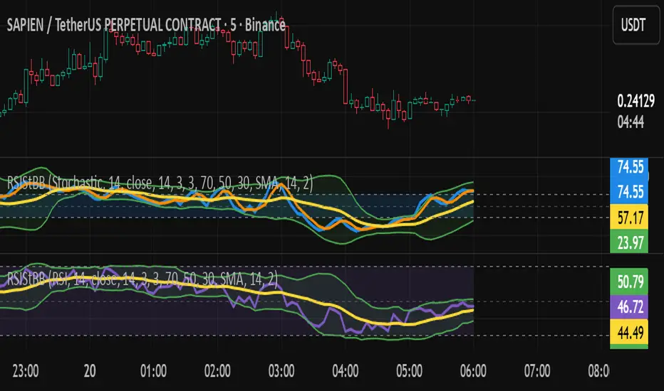 Compact oscillator panel that lets you switch the base between RSI and Stochastic %K, then overlays a moving average + Bollinger Bands on the oscillator values (not on price) to read momentum strength and squeeze/expansion.