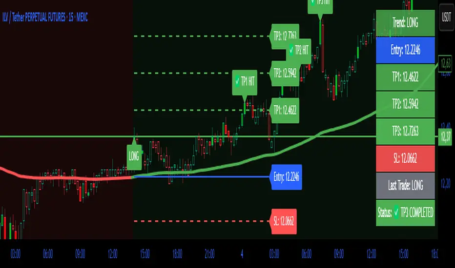 TrendSync TP Engine is a trend-following indicator that automatically detects trend direction based on how long the price stays above or below a defined EMA (Exponential Moving Average). Once a trend is confirmed, it plots entry, take-profit (TP), and stop-loss (SL) levels directly on the chart.