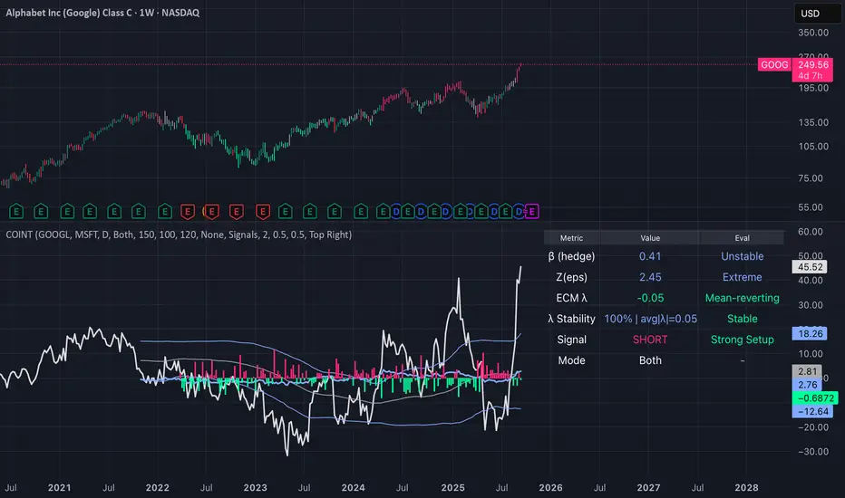 What this tool does is bring that theory into practice. It estimates a long-run equilibrium between two assets (Y ~ α + βX), calculates the residual spread (ε), and then evaluates whether that spread behaves in a mean-reverting way. The Z-Score tells you when the spread has moved far from its historical mean. The Error Correction Model (ECM) adds a second layer: it checks whether the spread tends to close again, and how strong that adjustment pressure is. If λ is negative and stable, the relationship is cointegrated and mean-reverting. If not, the pair is unstable — even if the Z-Score looks attractive.