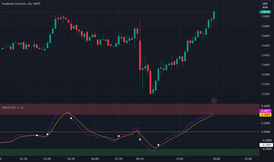 In the indicator I created it has the Oversold and Overbought areas highlighted to show the oscillators function as kind of an RSI + MACD indicator. There is also added crossing alerts in the form of circles (or whatever you want to change it to) indicating a cross of the SMI line and the Signal EMA line. This is usually the point where you want to make an entrance or exit point. The Overbought and Oversold zones are adjustable to wherever you as a trader feel comfortable having them be.