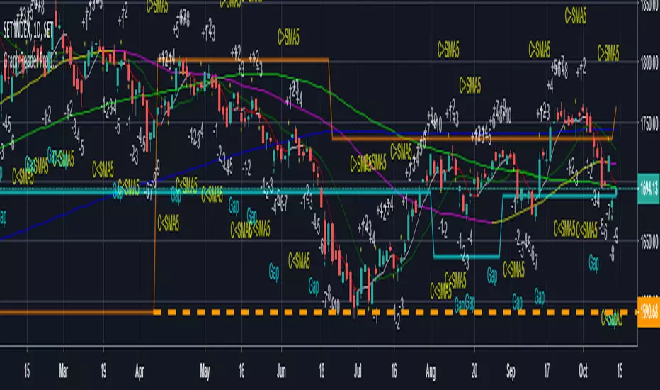 - Draw simple moving average lines such as SMA5, SMA50 with ability to change the line color based on increasing or decreasing prices. A set of other simple moving average lines such as SMA13, SMA200, SMA800 can be drawn if enabled.