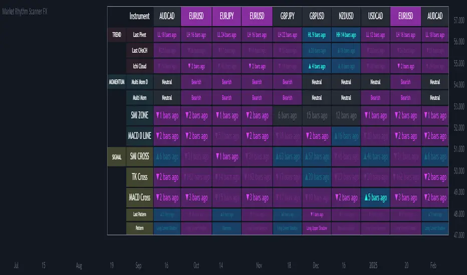 Embrace your inner data nerd with the Market Rhythm Scanner FX—the ultimate multi-asset intelligence platform for OANDA Forex pairs. From subtle pivot changes to daily momentum shifts, from candle patterns to MACD fireworks, it’s all consolidated into one easy-to-digest control panel.