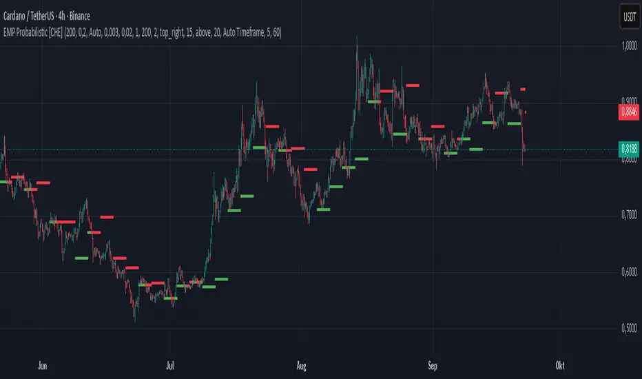 EMP Probabilistic \[CHE] turns raw price action into a clean, probability-aware map. It builds two adaptive bands around the session open of a higher timeframe you choose (called the S-timeframe) and highlights a robust median threshold. At a glance you know: