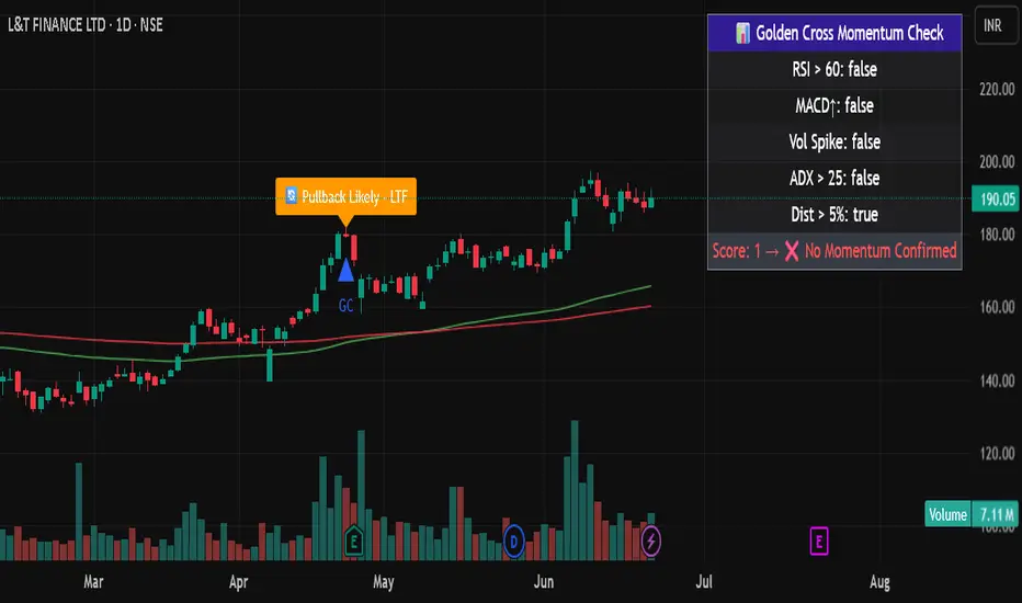 This indicator identifies Golden Cross events — where the 50 EMA crosses above the 200 EMA, signaling a potential long-term trend reversal — and evaluates the momentum strength to help determine whether price is likely to: