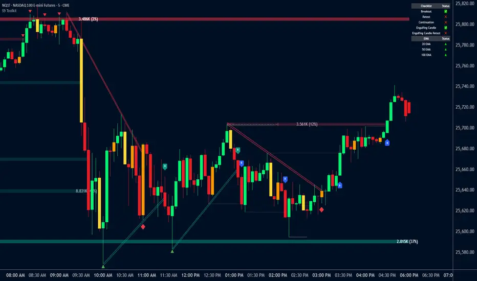 The S9 Toolkit is a multi-layered market structure and volume analysis indicator. It combines volumetric support and resistance, trendlines, engulfing candlesticks & zones, session volume profile, swing highs/lows, moving averages, and a checklist dashboard into one framework. Each component works independently while staying aligned with the others.