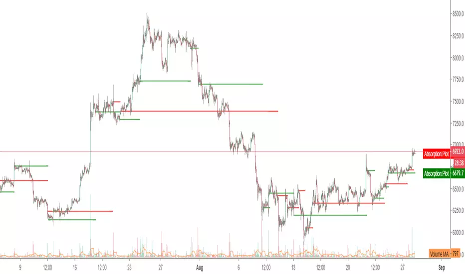 This new version of absorption measures it using Standard Deviation. You can set a minimum number of Sigma's of Absorption to be displayed. So now it will automatically adjust to the volume of the timeframe of that exchange and symbol. It will show you how much a price is supporting or resisting, by relatively how much volume it absorbs with minimal price change.開源腳本