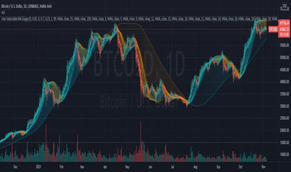 - This script is unique in that it allows the user to chart the "Guppy", except nearly everything about it is customizable. The user can change the source, period, and type of moving average used for every single line.
