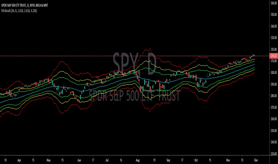 Fibonacci Bands are derived from Fibonacci ratios expansion from a fixed moving average.