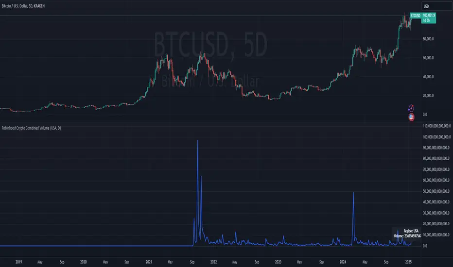 This indicator provides a comprehensive visualization of the combined trading volume for all cryptocurrency pairs available on Robinhood, tailored to the selected region (USA or Europe). The chart dynamically updates based on your selected region, providing actionable insights into market activity.