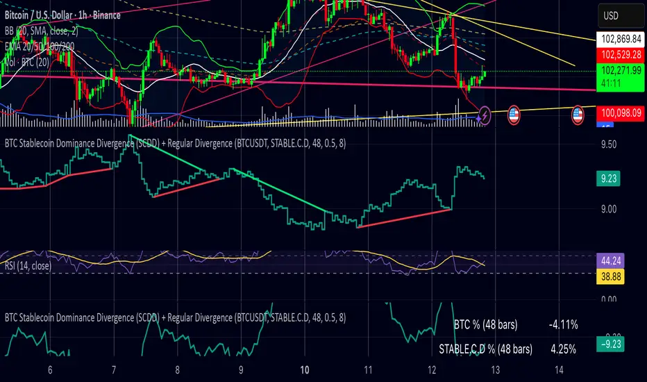 Slikdicator, Shows divergence between Stable Coin Dominance and lows and tops of BTC. Used to determine and exploit traps