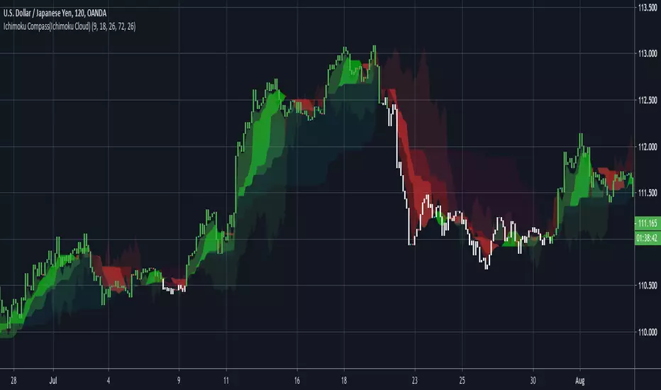 Ichimoku Cloud Indicator for visualizing support/resistance levels. Candles turn from green to white when negative trend is detected.