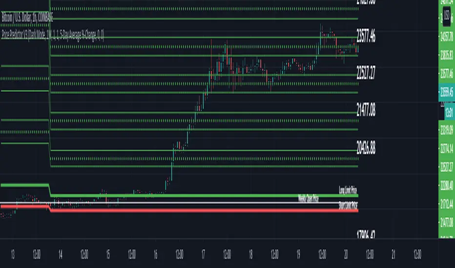 Price Predictor acquires potential targets by measuring the Average Change of Price from a user-defined resolution, from Open to Open. By default, the Resolution is set to 1 Day, however you can play around with Weekly, Monthly, etc. When a new resolution period begins, Price Predictor will automatically adjust based on the new Average Change of Price.