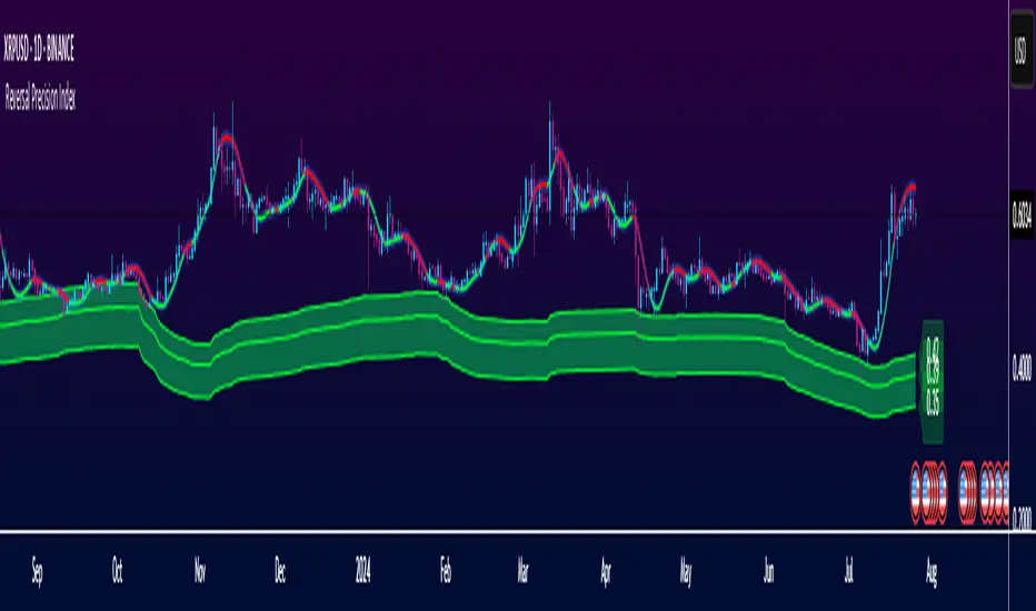 The Reversal Precision Index (RPI) is designed to assist traders in identifying potential reversal zones and tracking market trends. This overlay indicator combines a set of dynamic price channels with a customizable trend-following band, offering a robust framework for spotting key turning points and monitoring price action. Ideal for traders seeking to enhance their decision-making process, RPI is versatile across various timeframes and asset types.