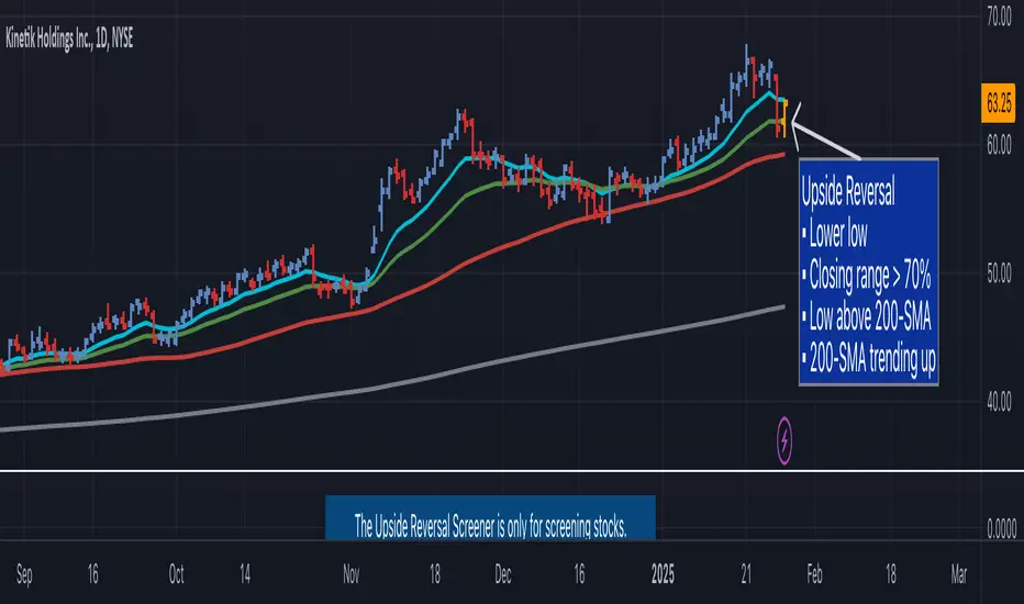 The Upside Reversal Screener can be helpful to find strength when stocks have been showing weakness or the overall market is down. An upside reversal in a stock occurs when its price, after declining, changes direction and begins to trend upward. This pattern can signify a shift in market sentiment from bearish to bullish.