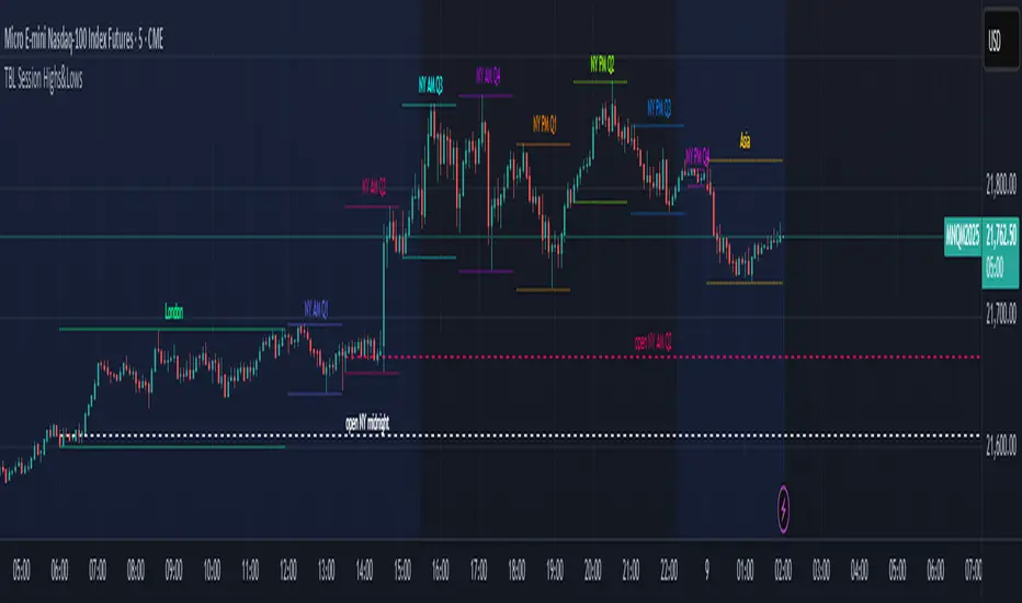 BL Session Highs&Lows is a versatile intraday tool that highlights key price levels within up to 11 configurable trading sessions. It displays session highs, lows, and optional open levels, with customizable lines, labels, and boxes — perfect for tracking price behavior across sessions like Asia, London, and New York.