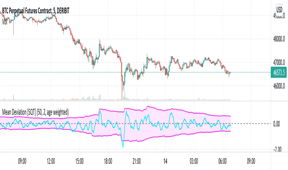 The indicator aims at detecting up and down moves that deviate substantially from their respective means. The up and down means are calculated separately taking the last N up or down candles into account (Use N candles). Based on these means the upper and lower bounds are calculated by adding or subtracting the distributions standard deviation (Sigma bounds), multiplied by a user specified factor. After a substantial move, the bounds will either decay sharply to their mean after N up or down candles have passed (Decay: equally weighted) or gradually (Decay: age weighted, weight can be adjusted in the Pine script). The equally weighted decay is meant to model persistent memory whereas the age weighted decay models fading memory of the market over the last N up or down candles. The upper and lower bounds constitute the shaded area. The signal line is simply an EMA with length 3 of the sum of the last 3 percentage changes. These values can be adjusted from the Pine script directly.