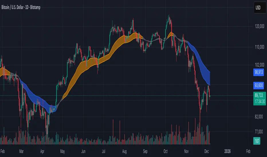 This script does not replicate, reverse-engineer, or replace any closed-source indicator. Instead, it provides a flexible, open-source framework that lets traders build their own trend-ribbon configuration inspired by similar visual concepts while maintaining full transparency. Because the calculations rely only on standard, well-known moving-average and ATR methods, traders can experiment freely with community-discussed presets without relying on proprietary tools.