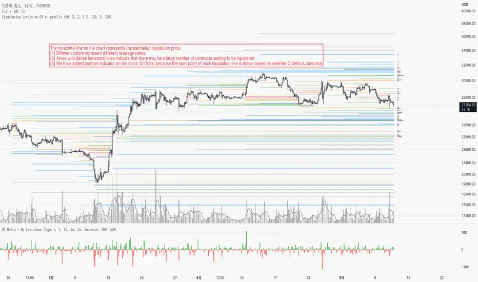 This indicator is used to display estimated contract liquidation prices. When there are dense liquidation areas on the chart, it indicates that there may be a lot of liquidity at that price level. The horizontal lines of different colors on the chart represent different leverage ratios. See below for details.