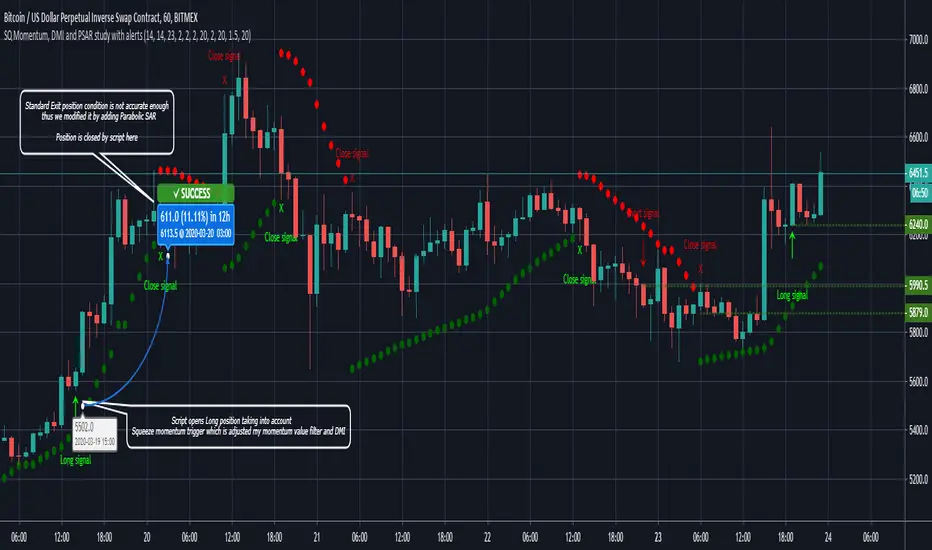 Sqeeze Momentum, DMI and Parabolic SAR study with alerts