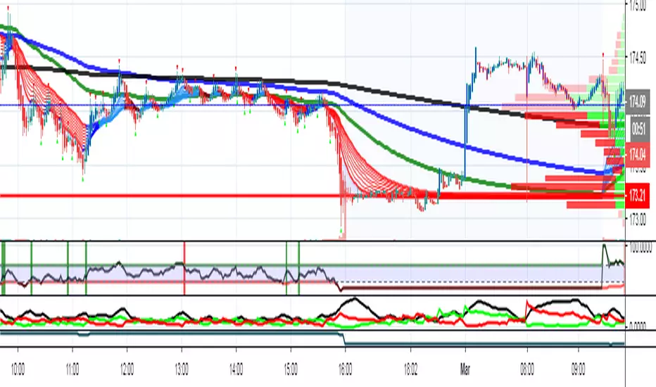 Uses a combination of different pivot calculations to determine when an equity has peaked or bottomed out and provides visual Buy and Sell indicators as well as the capability to set alerts for buy and sell actions.