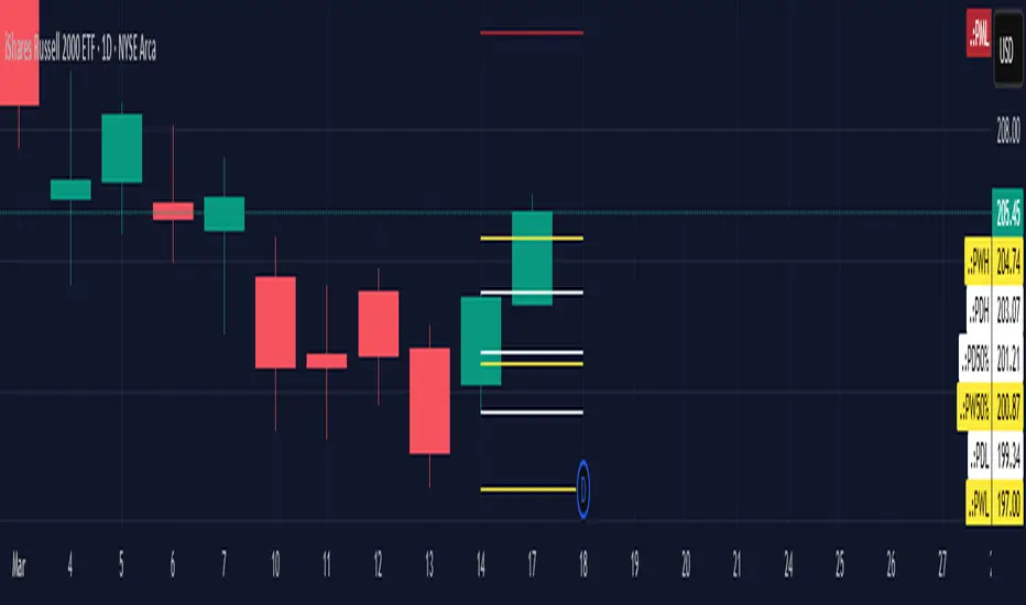 The script calculates the 50% midpoint of the previous candle’s high and low, a key support/resistance level for traders. It extends this logic across multiple timeframes, including daily, weekly, monthly, quarterly, and yearly, and tracks previous highs and lows for these periods. It also prints opening levels for various timeframes. The premarket high/low and ORB (Opening Range Breakout) levels are included when extended hours are enabled.