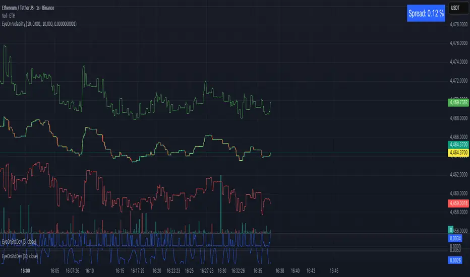 EyeOn Volatility tracks how market volatility affects trading spreads. It adapts dynamically using recent price fluctuations and shows symmetric bid/ask bands around the chart. A live info box displays the current spread in percent, and an optional panel lets you review spread history over time.
