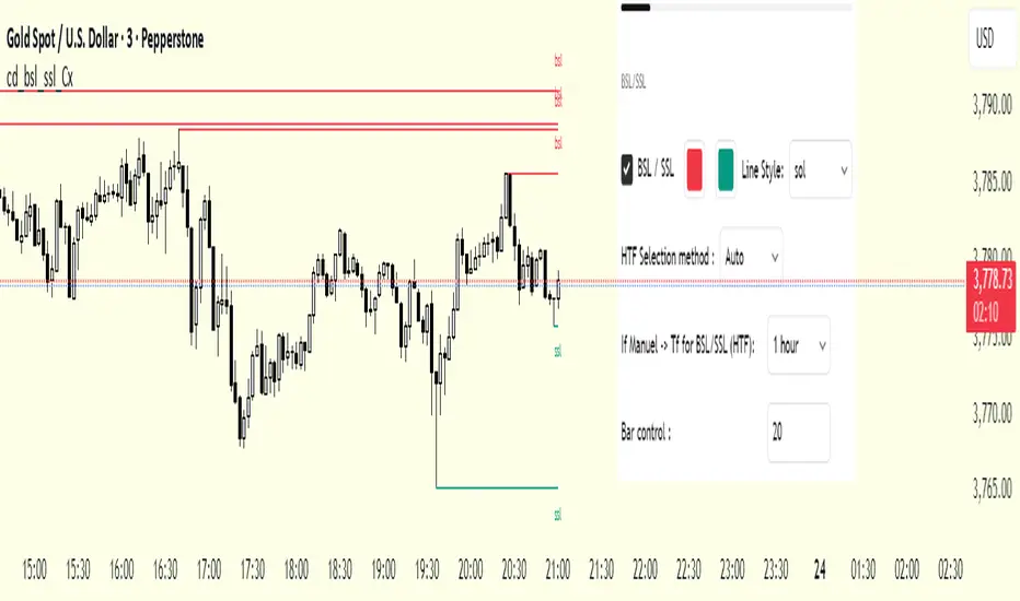 Swing levels formed on the aligned higher time frame (HTF) are displayed on the chart as Buy Side Liquidity (BSL) and Sell Side Liquidity (SSL).