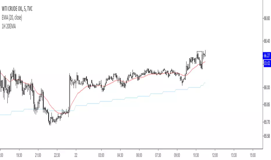 This script uses data from last 20 bars on 1H to compute the EMA and applies it to lower TFs. Optimal for scalping SP mini and CL on the 5M. It is an advantage to have the 20EMA on the 5M as well on the same screen.