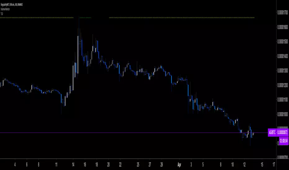 One use for the indicator is for cryptos, where one who does not wish to trade low volume markets can rely on the indicator to flag them. The default values of 300 and 1000 for the low and high limits mean that when looking at XXXBTC charts, a yellow dot will appear on the chart when the daily volume of the market is lower than 300 BTC, and a green dot will appear when it is higher than 1000 BTC.