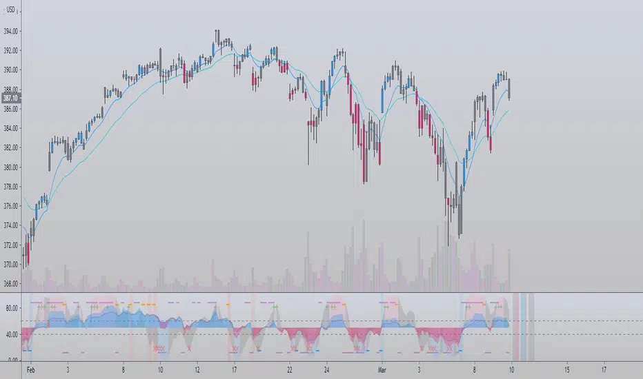 Red/green fill of stochRSI and purple/blue dots on RSI: When short RSI and stochRSI are both ob/os