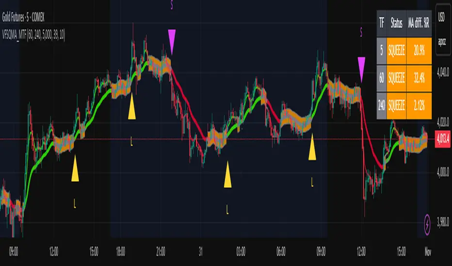 - Unlike the original indicator, the coloring of the MA curves on the chart depends on the relative positions of the fast MA and slow MA. The curves are colored bullish when the fast MA is above the slow MA, bearish when the opposite is true, and neutral in the squeeze zone.