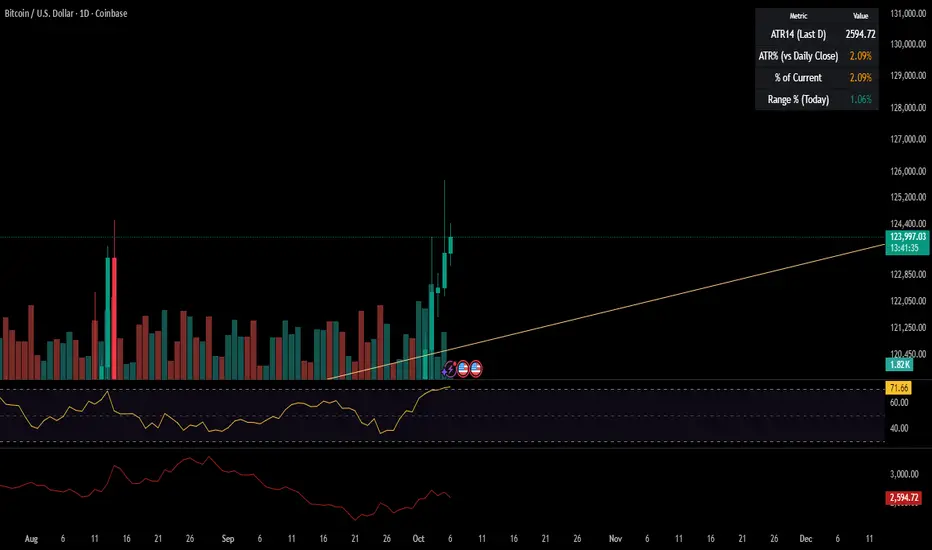 Visualizes daily volatility in context. Shows ATR(14) as % of Daily Close, % of Current Price, and Today’s actual Range%. When % of Current ≈ % of Close → volatility has already played out.