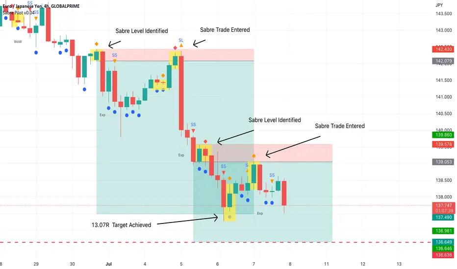 This indicator is the second generation identifier of high probability trading levels using the Sabre Trading System. Sabre Identifies where the potential of unfilled institutional orders is likely to result in a successful trade following the Sabre Trading System as taught by Anthony Navarro. This is a private Invite-Only script accessible to members of the Sabre Trading community.