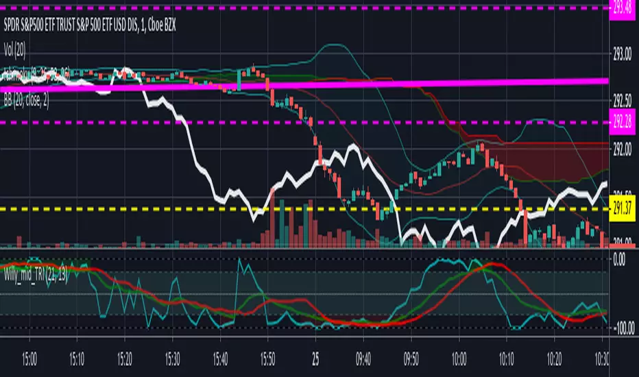 This is standard Williams %R originally written by another user that I modified. Credit to him whose name escapes me at the moment. The green line is 13EMA and red line is 13SMA (offset by 2 for timing trades). Great for very quick trades/day trades. Green over red = long. Red over Green = short.
