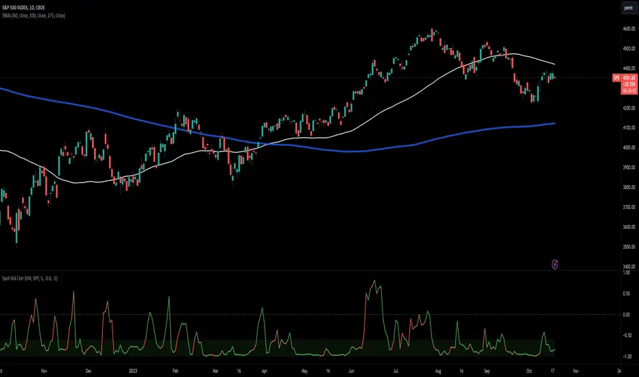 This TradingView script measures the correlation between percentage changes in the spot price (e.g., for SPY, an ETF that tracks the S&P 500 index) and the changes in volatility (e.g., as indicated by the VIX, the Volatility Index). Its primary objective is to discern whether the relationship between spot price and volatility behaves as expected ("normal" condition) or diverges from the expected pattern ("abnormal" condition).