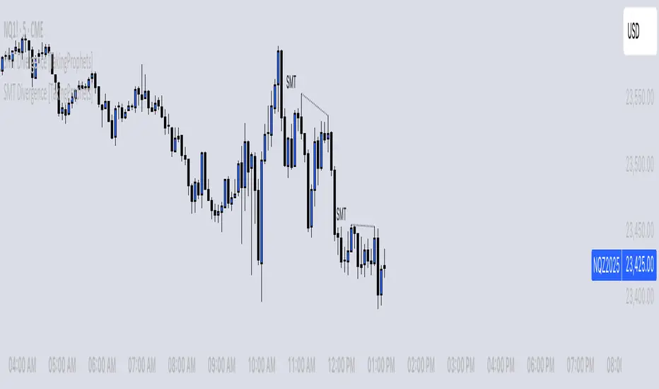OverviewThe SMT Divergence indicator is a powerful tool for Forex and Futures traders following Inner Circle Trader (ICT) concepts. It detects Smart Money Technique (SMT) divergences by comparing price action between two correlated instruments—typically a primary asset (e.g., NQ, ES, DXY) and a comparison symbol (e.g., another index, currency pair, or bond).