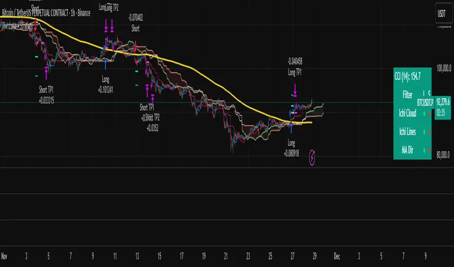 Red line — SL (if not using Ichimoku Trailing; with trailing, the red line is updated dynamically).