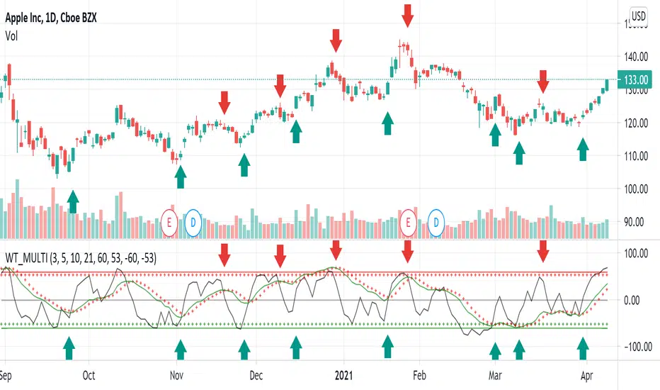 This is a modification of LazyBear's WaveTrend. The SMA trend has been removed and a shorter time frame EMA has been added in black. The idea is to buy when the shorter time frame starts to curl up and the longer time frame, green, has started to either flatten out or curl up too. Sell when the shorter time frame has started down and green has either flattened or bottomed out as well. The black line will generate some noise so the key is to use the two in combination. My final goal would be to have the green line looking at daily candles and the black line looking at a 2 or 4 hour candle, but I haven't figured out how to do that.
