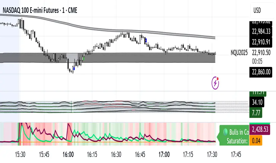 A saturation percentage quantifies the intensity of the current dominant side (bulls or bears) relative to recent highs.