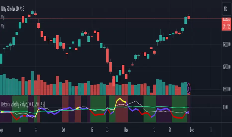 2. The back ground color has three components. Green zone is the zone where overall volatility is on the lower side. Red zone is the zone where overall volatility is on the higher side. Purple zone means fluctuating volatility.