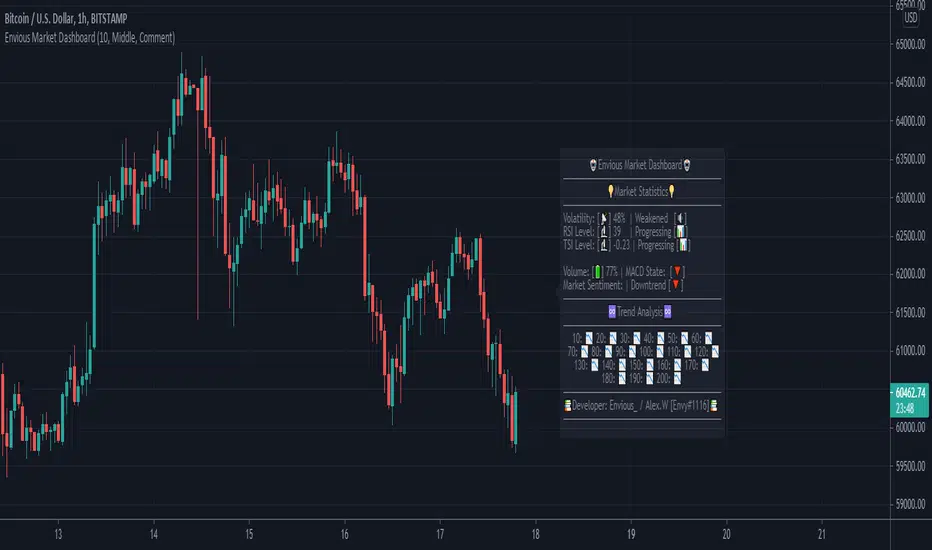 Hey traders, this is a market dashboard that can be useful to have on top of your charts. It provides information of the trends discovered, the volatility, the current MACD Trend, the current trend, RSI level, RSI Overbought / Oversold state, TSI level, TSI Overbought / Oversold state, the volume percentage, and more. You can customise the dashboard location, the colour of the dashboard, the background of the dashboard and its background colour. Hope this is useful to you traders :).