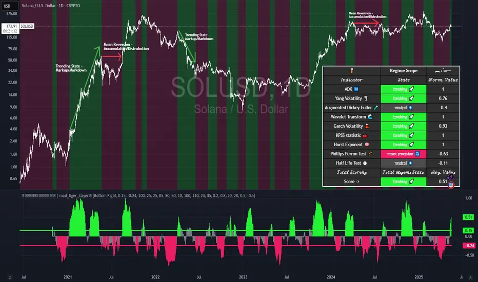 Regime Scope is an advanced multi-factor market regime identifier meticulously engineered to determine whether an asset is exhibiting trending behavior (Markup/Markdown phases) or mean-reverting dynamics (Sideways - Accumulation/Distribution). By integrating and synthesizing outputs from nine rigorously chosen statistical and volatility-based models, this tool offers a unified framework for assessing regime conditions with precision.