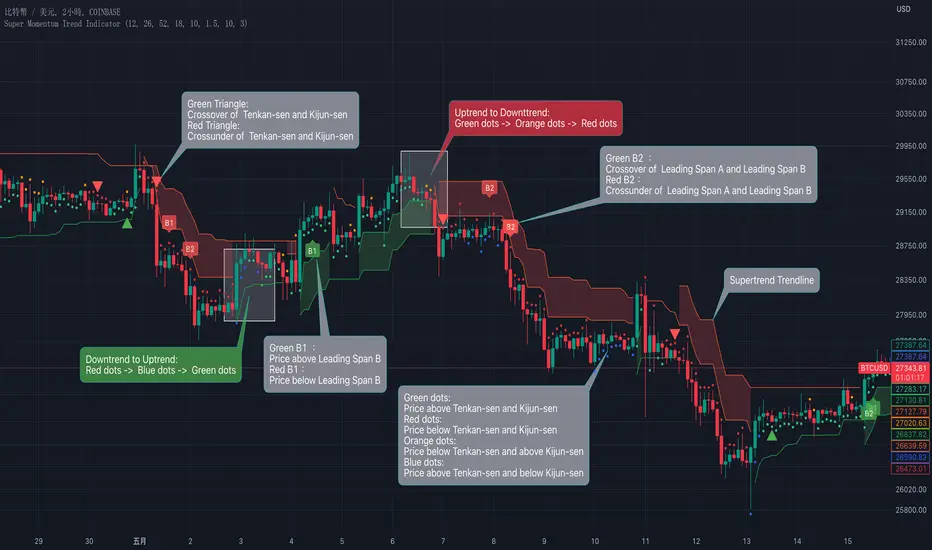 This is a trend momentum indicator that uses some of Ichimoku Cloud's core trading concepts and Supertrend, so before using this indicator, you can first understand Ichimoku Cloud, which is very helpful for understanding this indicator.