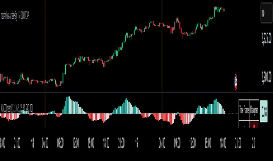 • Customizable Inputs: Users can adjust the MACD settings, histogram colors, and timeframe options.