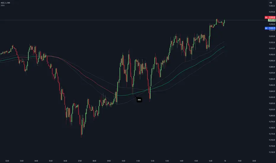 The "Median Moving Average" (MMA) It allows users to select from two moving average lengths—short and long—and plots the median moving average, which is the midpoint between these two averages. Colored green for upward trends and red for downward trends, enhancing visual analysis.