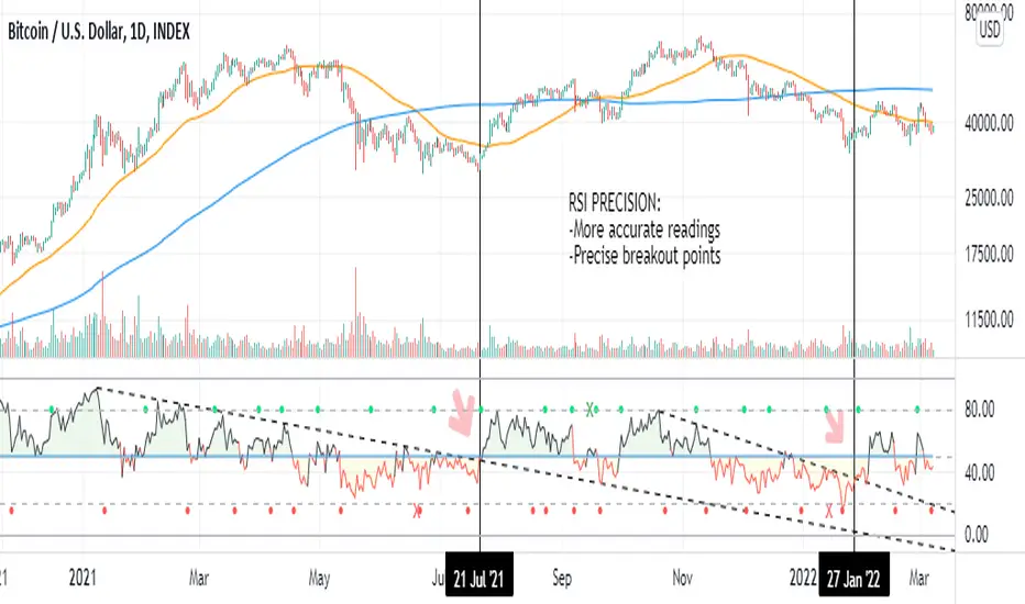 RSI PRECISION is an oscillator designed to enhance the classic RSI with price volatility and make it more accurate at longer time frames and during choppy market conditions. The oscillator is ideal for analyzing volatile markets, such as the cryptocurrency market.