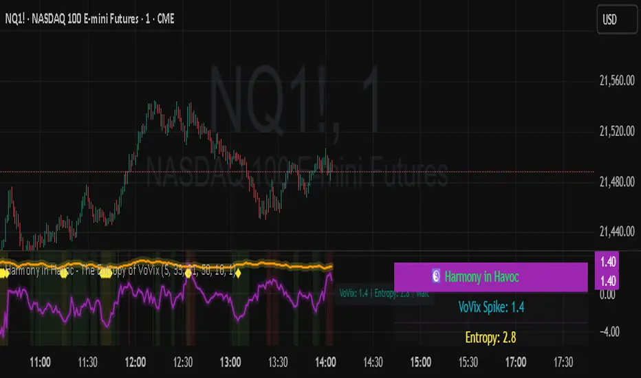 This script uniquely combinesVoVix (volatility-of-volatility) and real-time entropy to detect rare moments when the market is not just volatile, but also breaking its own patterns. VoVix alone detects sudden volatility changes; entropy measures the unpredictability of those changes. Together, they highlight regime shifts that neither can identify alone.