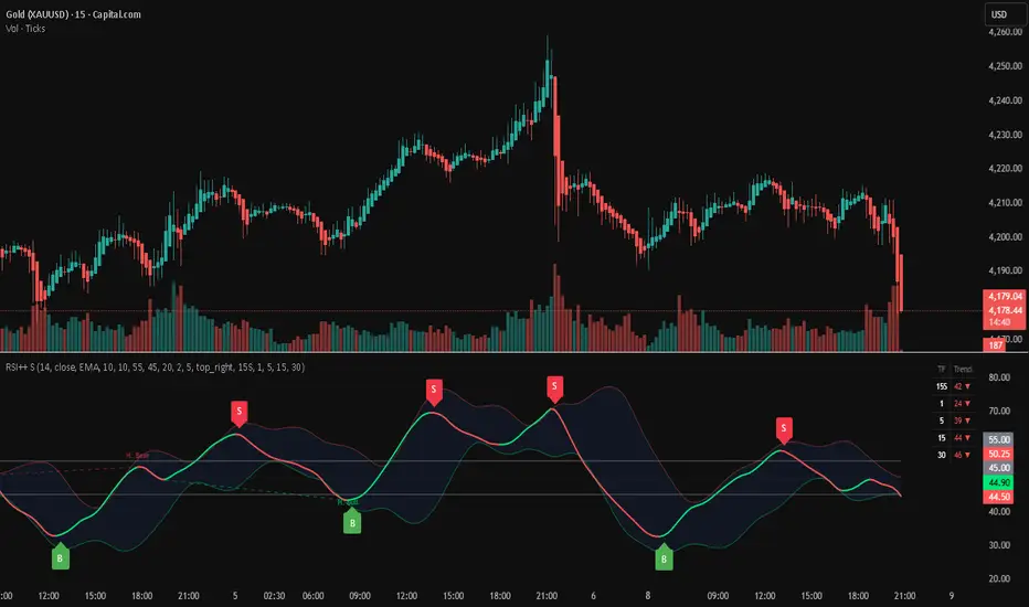 Precision 'B'uy & 'S'ell Reversal Signals When the smoothed RSI changes direction from an extreme (overbought or oversold) zone, the indicator plots clear 'B' (Buy) or 'S' (Sell) labels. These are filtered signals designed to highlight high-probability reversals from significant momentum exhaustion.